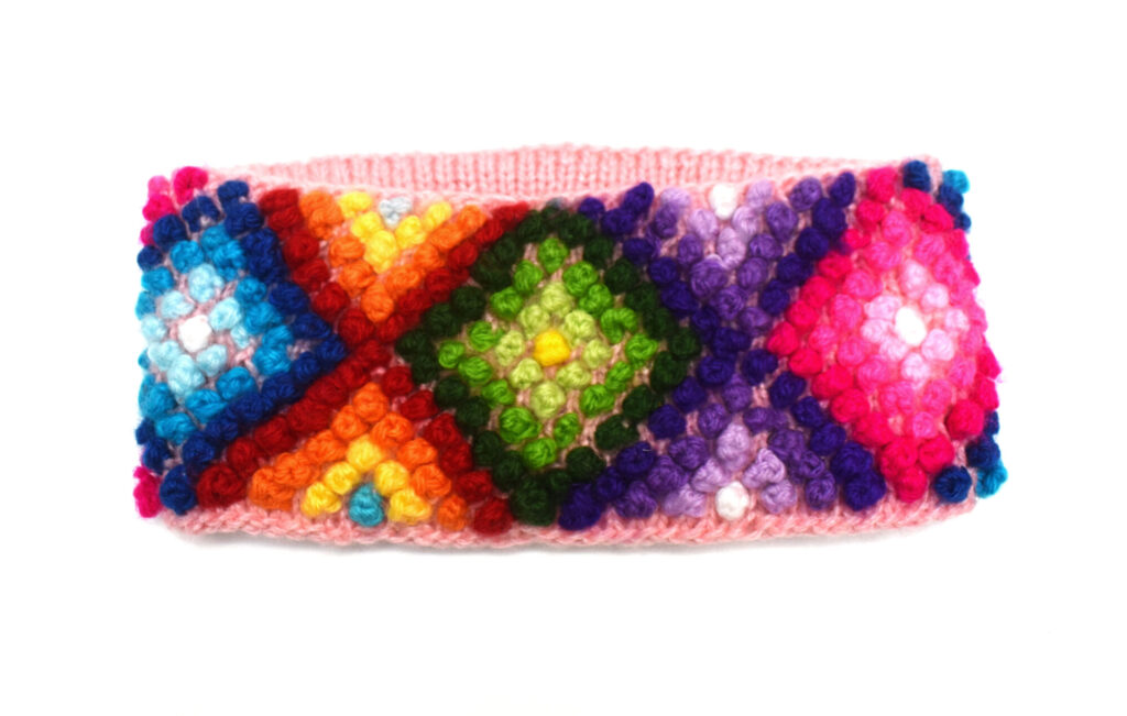 Příjemná pestrobarevná čelenka s tradičním peruánským zdobením. V galerii je pro ukázku fotografie jiné barevné varianty této čelenky na postavě.