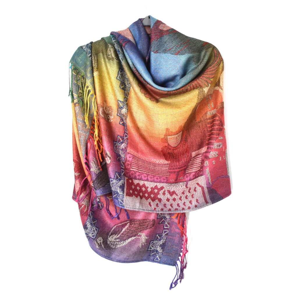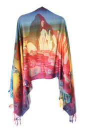Krásný a příjemný šál v duhových barvách s peruánskými motivy a obrysy Machu Picchu. Je skvěle multifunkční - můžete si ho nastylizovat mnoha způsoby nebo využít i jako přikrývku. V zimě skvěle zahřeje, v létě se hodí přes den jako deka na piknik a večer zahřeje při posezení s přáteli.