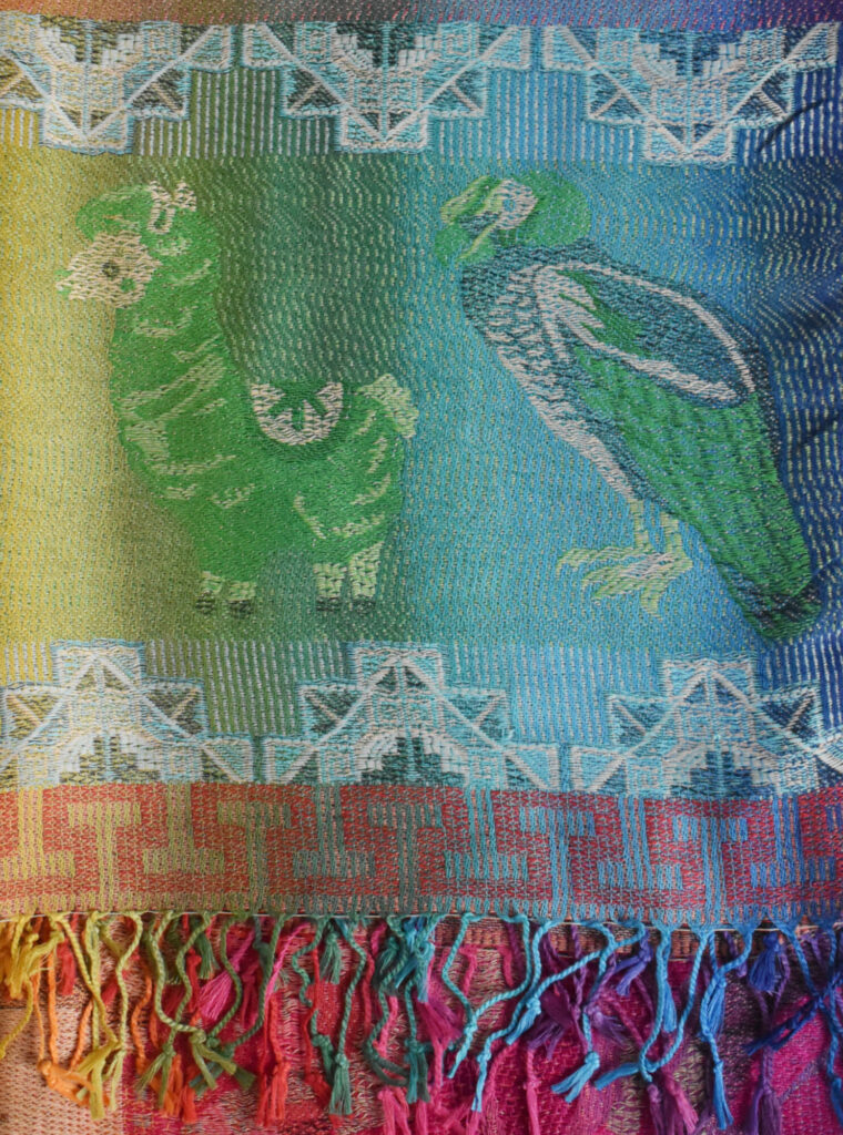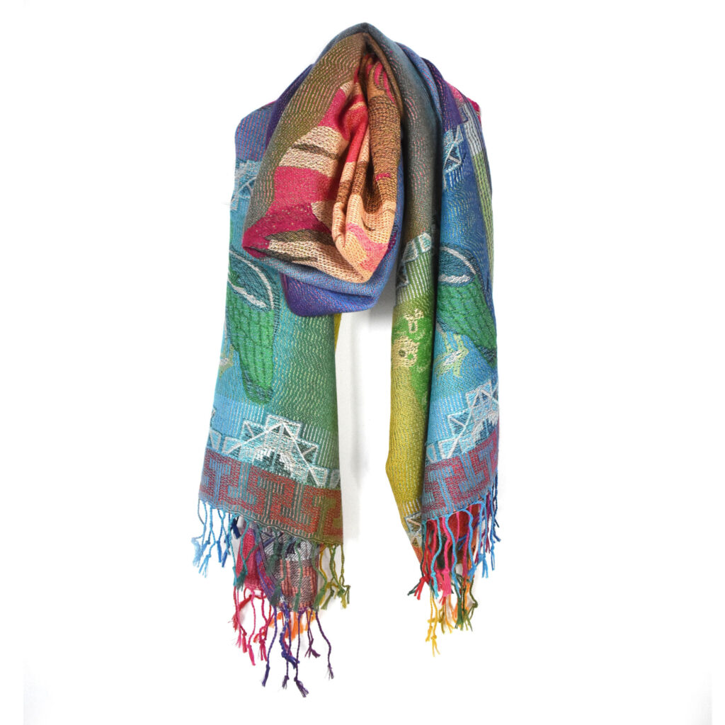 Krásný a příjemný šál v duhových barvách s peruánskými motivy a obrysy Machu Picchu na druhé straně.