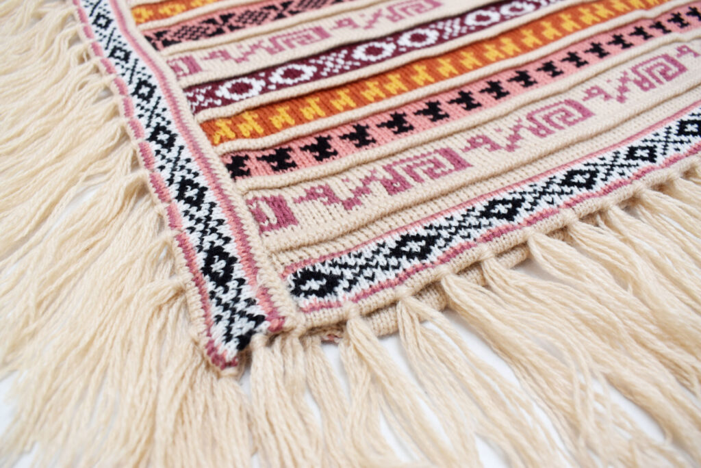 Jemné pletené pončo béžové barvy s třásněmi znázorňující různé tradiční peruánské motivy. Je lehké, ale krásně zahřeje díky vlně z alpaky. Velikost je univerzální odpovídající S-L.