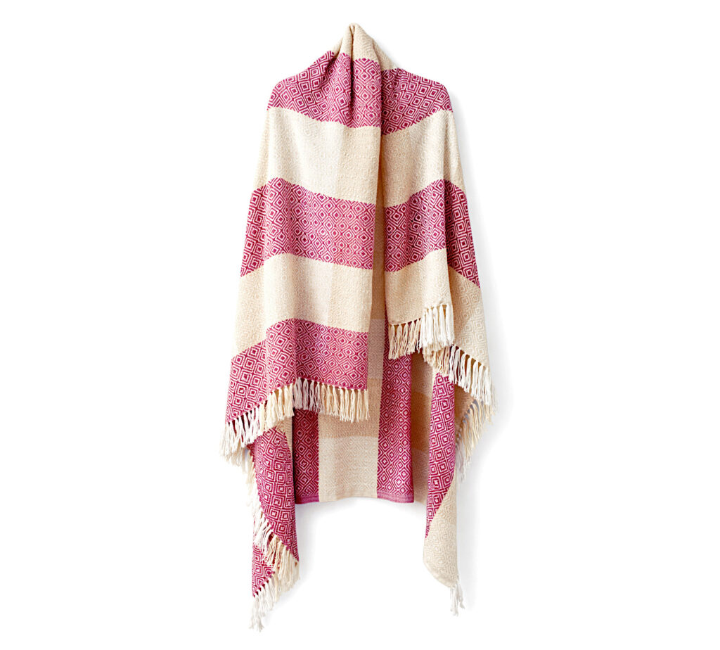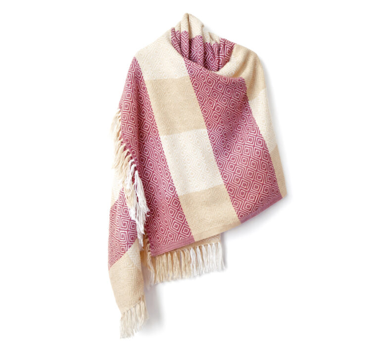 Krásný pléd větších rozměrů je příjemně hebký a měkký díky příměsi alpaky. Větší rozměry plédu nabízí jeho všestranné použití: jako pléd přes ramena, velký šál, deku nebo třeba přehoz.