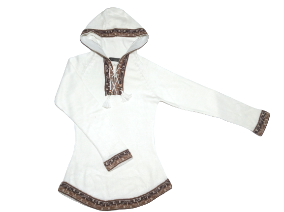 Nádherný měkoučký bílý svetr s hnědým lemem s kapucí ze 100% alpaky, precizně zpracovaná vlna alpaka v rodinné firmě Quiro. Vypasovaný ženský střih, který vám vytvoří krásnou siluetu. Svetr má raglánové rukávy, které se snadno přizpůsobí každé šířce ramen. Na zakončení šňůrek má ozdobné, ručně malované keramické korálky s andskou tématikou (příroda a lamy).