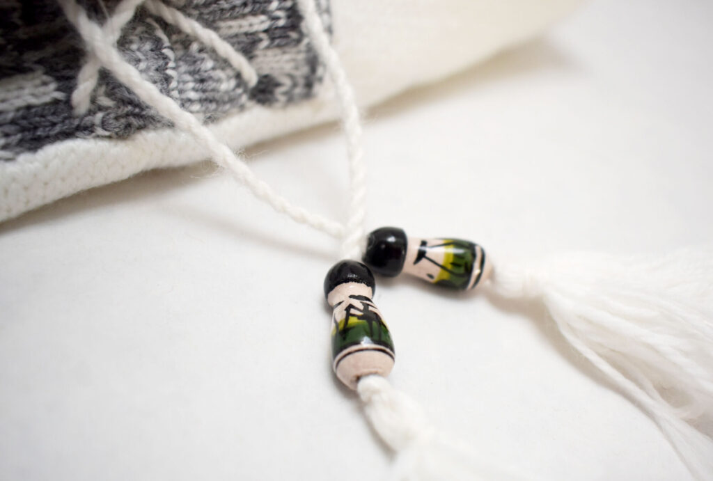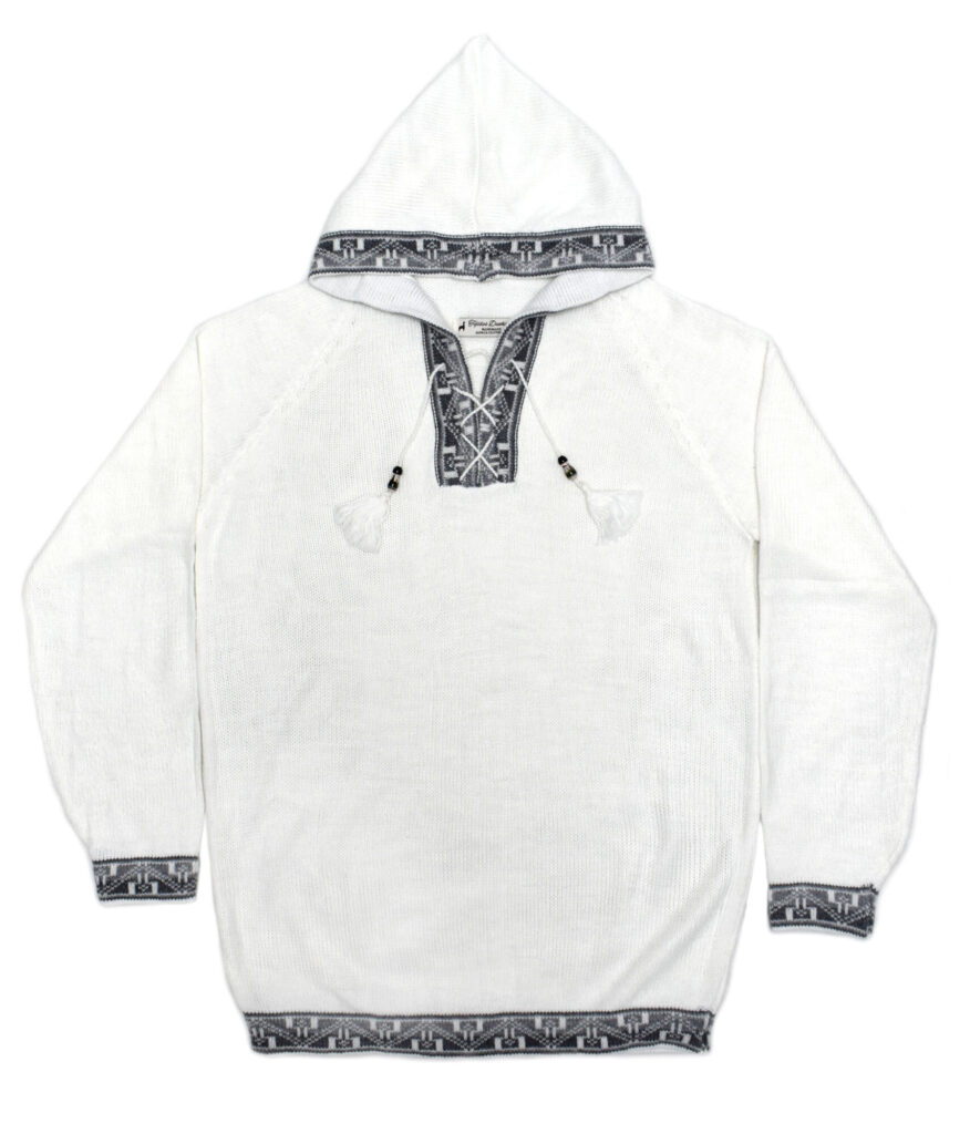Měkký bílý svetr s kapucí ze 70% alpaky značky Dueñas. Díky vyššímu podílu vlny alpaky je velmi jemný a příjemný na nošení. Svetr je volného střihu a neobepíná postavu. Má dlouhé raglánové rukávy, které se snadno přizpůsobí každé šířce ramen. Střih je tak vhodný pro ženy i muže, sedí velikostem L i menšímu XL. Na zakončení šňůrek má ozdobné, ručně malované keramické korálky s andskou tématikou (příroda a lamy).