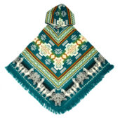 Jemné pletené pončo modré barvy s třásněmi znázorňující různé tradiční…