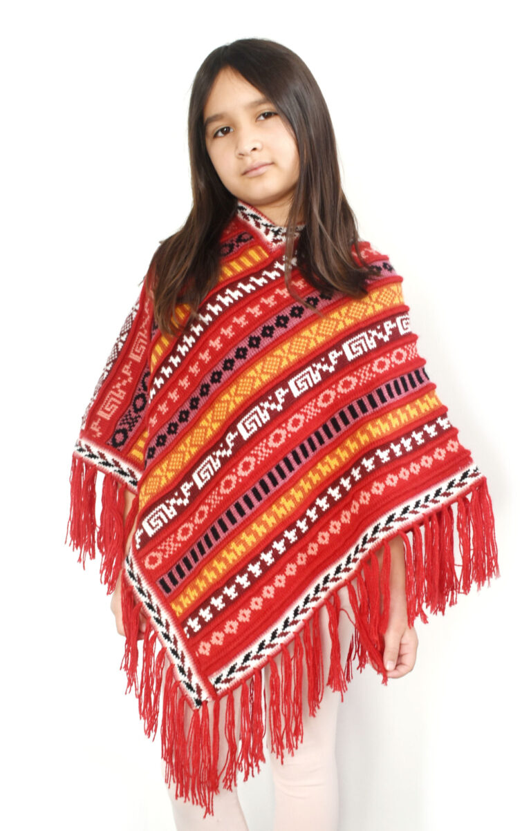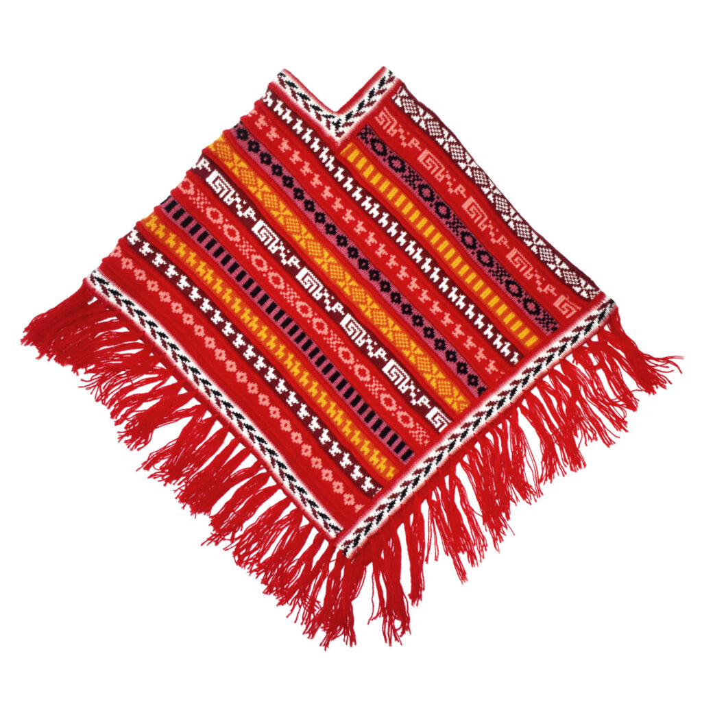 Jemné pletené pončo červené barvy s třásněmi znázorňující různé tradiční peruánské motivy. Je lehké, ale krásně zahřeje díky vlně z alpaky. Vlna z alpaky neškrábe ani nekouše a tak je pončo příjemné na nošení. Ideální na výlet do přírody, ale parádu udělá i ve městě.
