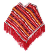 Jemné pletené pončo červené barvy s třásněmi znázorňující různé tradiční…