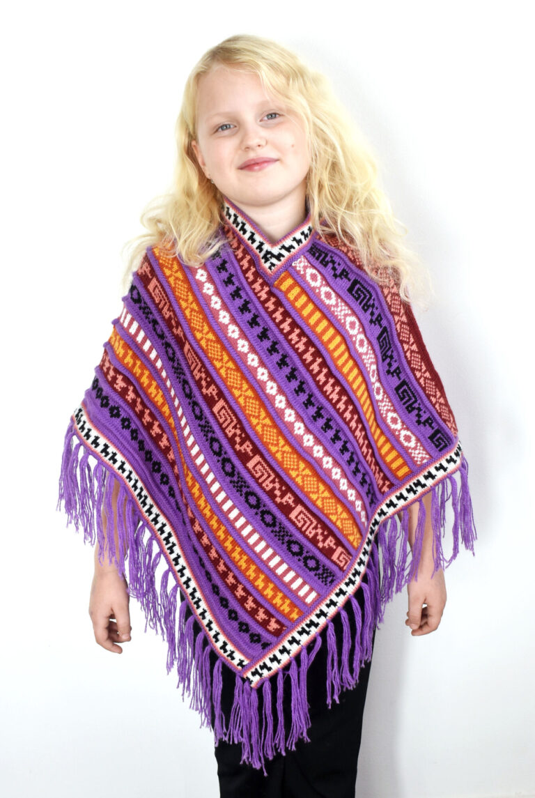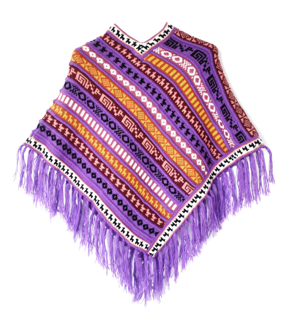 Jemné pletené pončo fialové barvy s třásněmi znázorňující různé tradiční peruánské motivy. Je lehké, ale krásně zahřeje díky vlně z alpaky. Vlna z alpaky neškrábe ani nekouše a tak je pončo příjemné na nošení. Ideální na výlet do přírody, ale parádu udělá i ve městě.