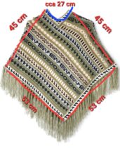 Jemné pletené pončo khaki barvy s třásněmi znázorňující různé tradiční peruánské motivy. Je lehké, ale krásně zahřeje díky vlně z alpaky. Vlna z alpaky je hypoalergenní, neškrábe ani nekouše a tak je pončo příjemné na nošení.