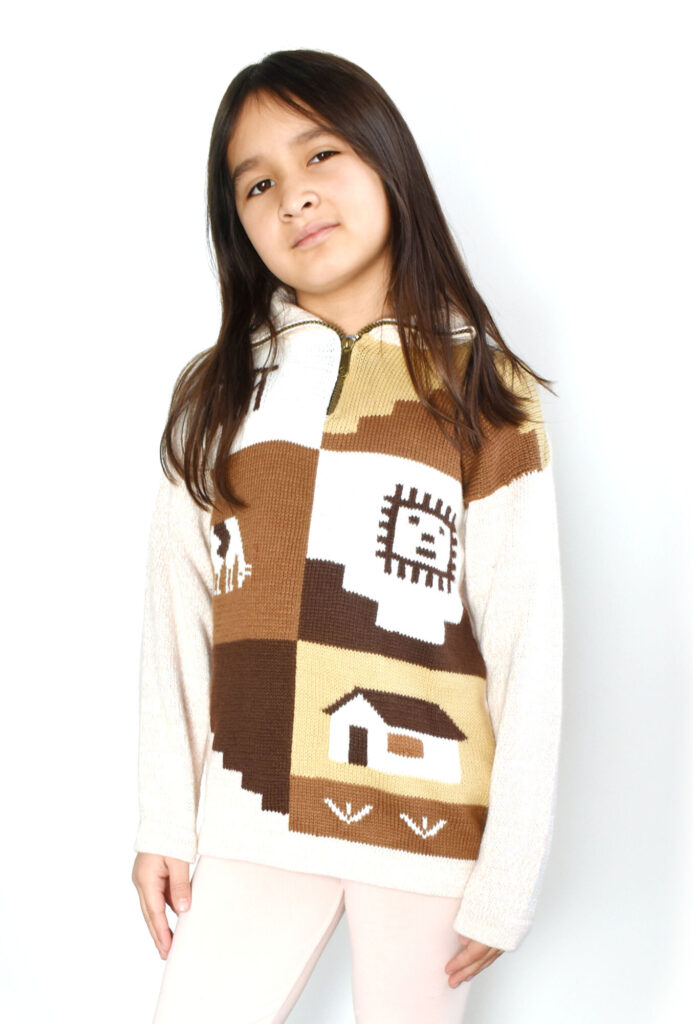 Příjemný dětský svetr přes hlavu s límečkem na zip. Vyroben ze směsi vlny z alpaky a akrylového vlákna. Je lehký a přitom velice dobře hřeje. Vlna z alpaky neškrábe ani nekouše a tak je svetřík příjemný na nošení. Ideální na výlet do přírody, ale parádu udělá i ve městě.