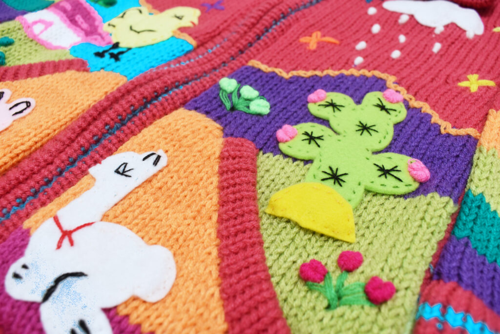 Dětský svetr plný barev a zvířátek vyráběný peruánskou tradiční technikou zvanou „arpillería peruana“. Je to technika, při které je oblečení dozdobeno výšivkami a kousky látek a zobrazuje různé výjevy ze života. V případě těchto dětských svetrů jsou hlavními motivy výjevy z peruánského venkova - zvířátka a příroda. Každý svetr je ručně dozdobený a je tak jedinečným a s láskou vytvořeným originálem, který potěší každou dětskou duši.