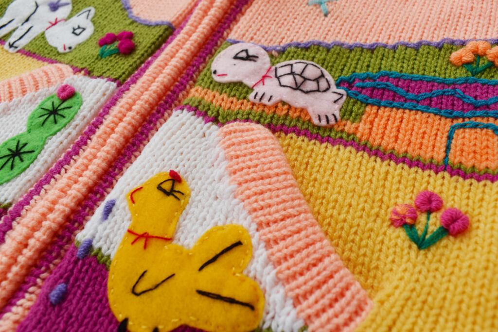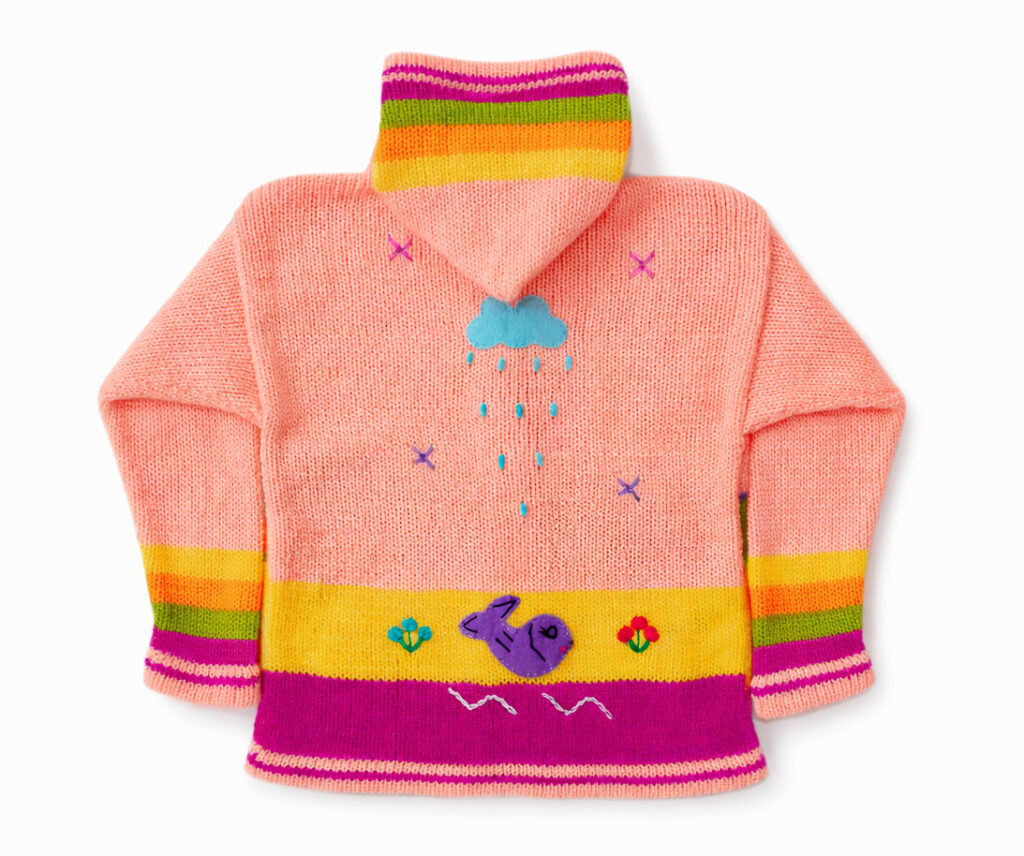 Dětský svetr plný barev a zvířátek vyráběný peruánskou tradiční technikou zvanou „arpillería peruana“. Je to technika, při které je oblečení dozdobeno výšivkami a kousky látek a zobrazuje různé výjevy ze života. V případě těchto dětských svetrů jsou hlavními motivy výjevy z peruánského venkova - zvířátka a příroda. Každý svetr je ručně dozdobený a je tak jedinečným a s láskou vytvořeným originálem, který potěší každou dětskou duši.