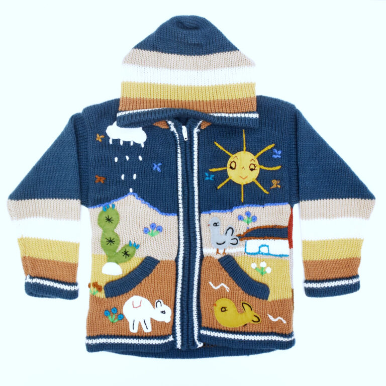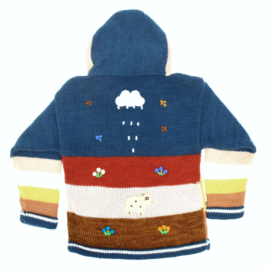 Krásný dětský svetr plný barev vyrobený ze směsi vlny z alpaky a akrylového vlákna. Je lehký a přitom velice dobře hřeje. Vlna z alpaky neškrábe ani nekouše a tak je svetřík příjemný na nošení. Je ručně dozdobený, takže každý svetr je originál. Ideální do lesní školky nebo na výlet do přírody, ale parádu udělá i ve městě. Níže ve fotogalerii naleznete fotku svetru stejného typu na postavě.