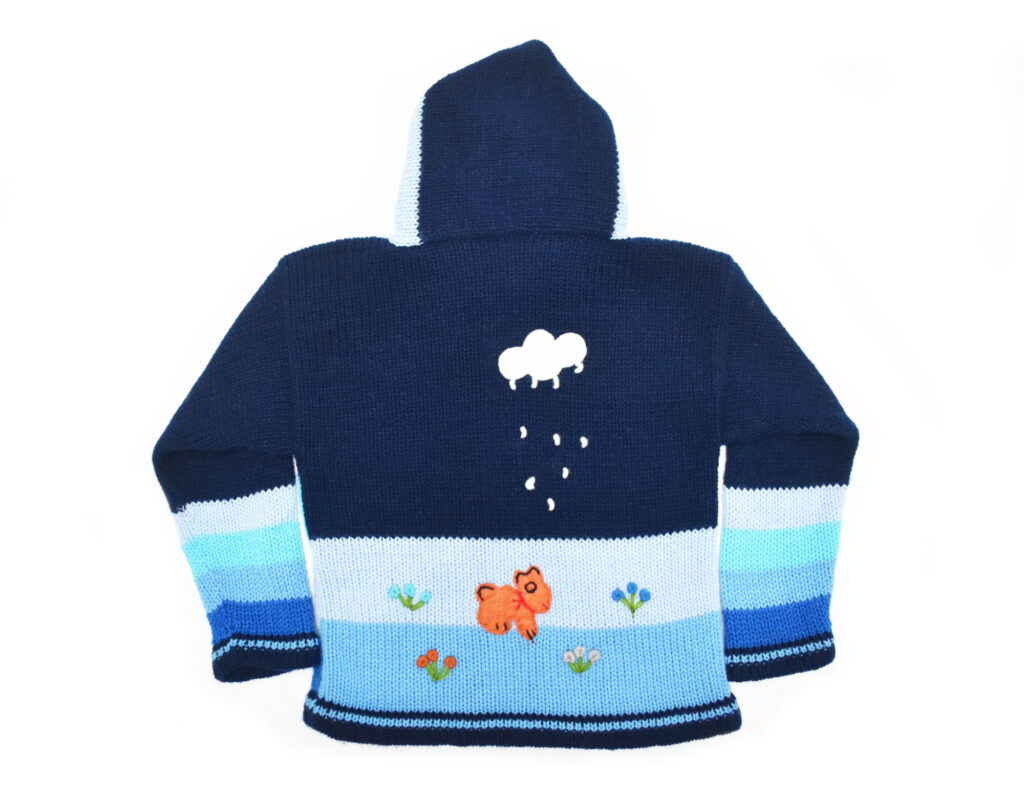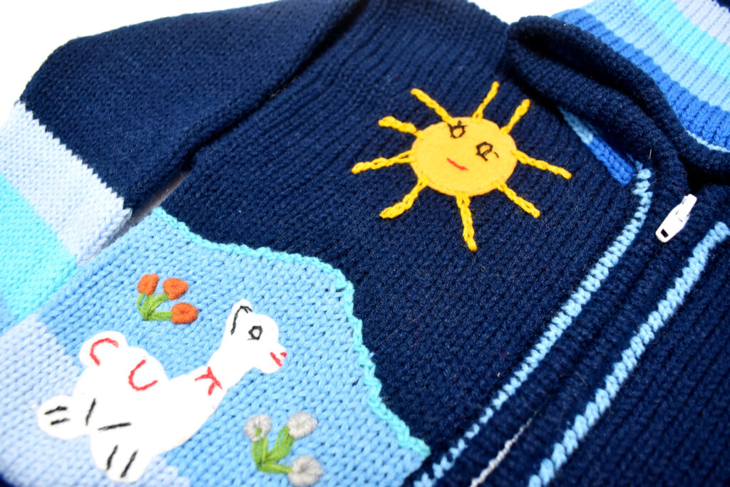 Dětský svetr plný barev a zvířátek vyráběný peruánskou tradiční technikou zvanou „arpillería peruana“. Je to technika, při které je oblečení dozdobeno výšivkami a kousky látek a zobrazuje různé výjevy ze života. V případě těchto dětských svetrů jsou hlavními motivy výjevy z peruánského venkova - zvířátka a příroda. Každý svetr je ručně dozdobený a je tak jedinečným a s láskou vytvořeným originálem, který potěší každou dětskou duši.