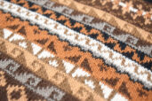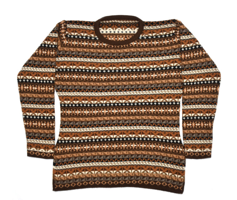 Nádherně jemný a hřejivý svetr v hnědých odstínech. Výrazný peruánský vzor dává svetru osobitý charakter a díky vypasovanému střihu zároveň působí velmi žensky. Díky kombinaci angory a alpaky je svetr velmi příjemný na dotek a krásně zahřeje.