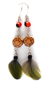 Ručně vyráběné náušnice z liány Ayahuasca zalité v pryskyřici dozdobené pírky běžných amazonských ptačích druhů. Ayahuasca (Banisteriopsis caapi) je liánovitá rostlina, která je používána pro výrobu halucinogenního nápoje původními indiánskými kmeny v Amazonii. V kečuánštině znamená „liána mrtvých“ či „liána duše“. Tradičně je užívána jako prostředek k léčení, dále pro komunikaci se světem duchů a při dalších rituálech. V mnoha kulturách je pírko součástí ochranných talismanů. Představuje vzdušný živel a pomáhá v komunikaci mezi světem živých a mrtvých, a proto je používáno v mnoha rituálních obřadech. Pírko vnáší do života svobodu a lehkost.
