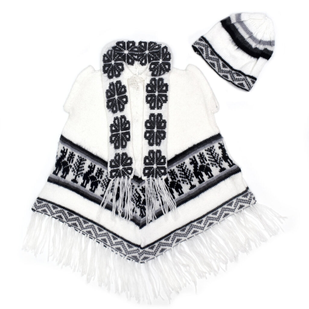 Krásné dětské pončo s krátkým rukávem s třásněmi a s čepičkou. Vyrobeno ze směsi vlny z alpaky a akrylového vlákna (50% vlny z alpaky). Je lehké a přitom velice dobře hřeje, zároveň má dobrou termoregulaci, takže se děti nepřehřívají. Vlna z alpaky je hypoalergenní, neškrábe ani nekouše a tak je svetřík příjemný na nošení.