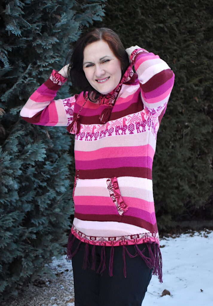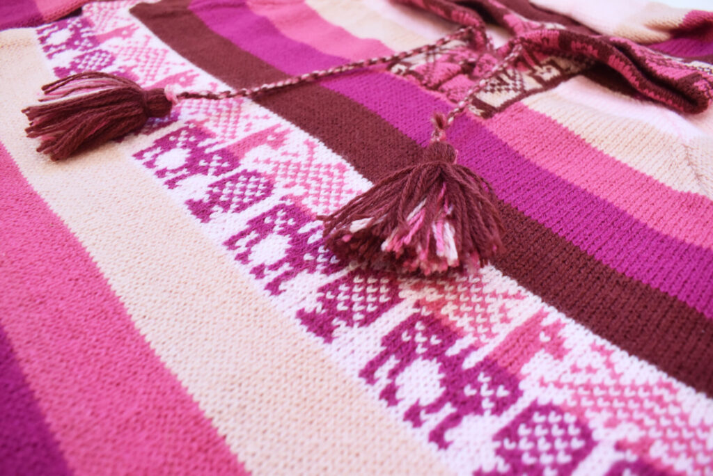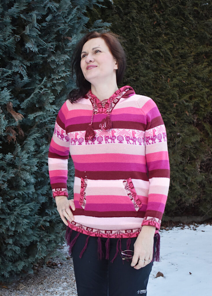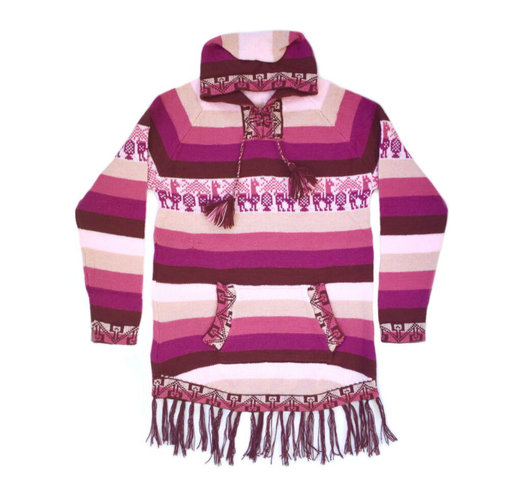 Krásný pružný svetr s kapucí a malými kapsičkami, oblékaní přes hlavu. Utkaný na míru ve větší velikosti pletařem z Arequipy. Vyroben ze směsi vlny z alpaky a akrylového vlákna Je lehký a přitom velice dobře hřeje. Vlna z alpaky neškrábe ani nekouše a tak je svetřík příjemný na nošení.
