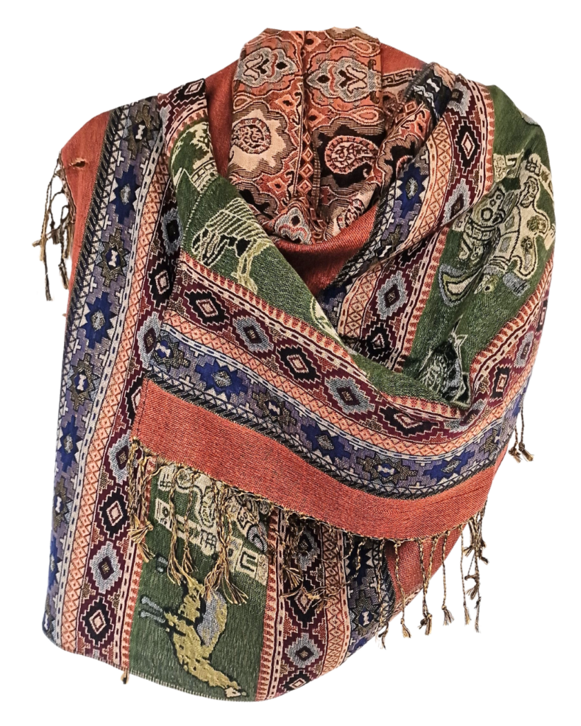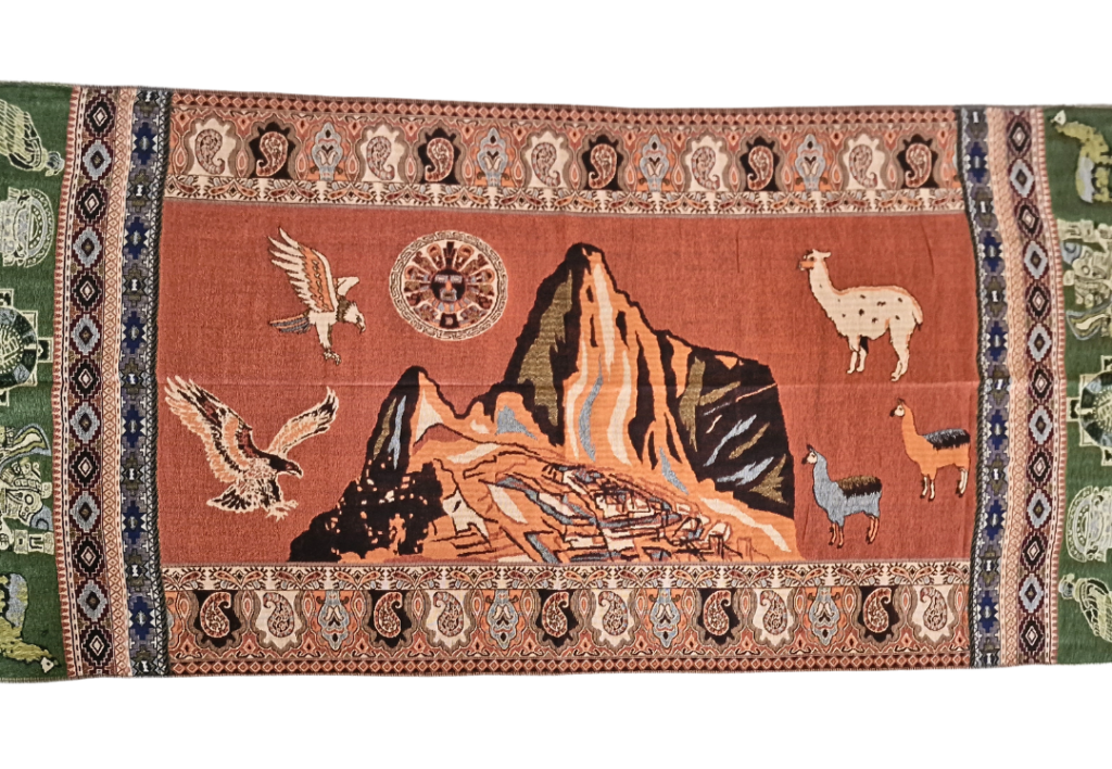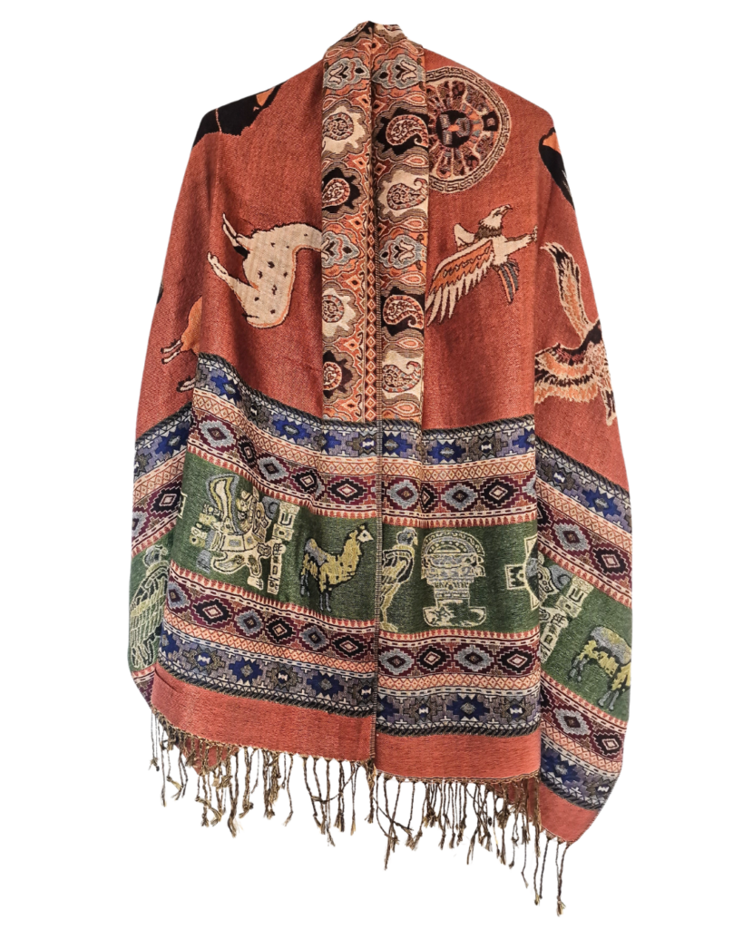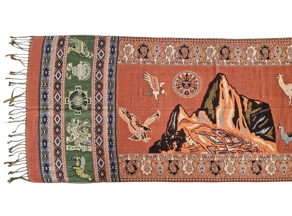 Krásný a příjemný šál s peruánskými motivy a obrysy Machu Picchu. Je skvěle multifunkční - můžete si ho nastylizovat mnoha způsoby nebo využít i jako přikrývku. V zimě skvěle zahřeje, v létě se hodí přes den jako deka na piknik a večer zahřeje při posezení s přáteli.