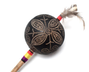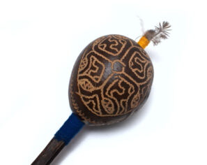 Ručně vyráběné v Posvátném údolí Inků, se symbolickými vyřezávanými ornamenty a pírky. Pírko představuje vzdušný živel a pomáhá v komunikaci mezi světem živých a mrtvých, proto je používané v mnoha rituálních obřadech. Pro šamany je chřestidlo jeden z nejdůležitějších nástrojů. Používají ho při zahájení a zakončení ceremonií (otevírání a uzavírání energetického prostoru) a také k energetickému pročištění osob a míst. Barva nitek a peříček se může lišit, každý kus je originál.