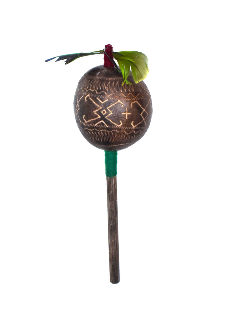 Ručně vyráběné v Posvátném údolí Inků, se symbolickými vyřezávanými ornamenty a pírky. Pírko představuje vzdušný živel a pomáhá v komunikaci mezi světem živých a mrtvých, proto je používané v mnoha rituálních obřadech. Pro šamany je chřestidlo jeden z nejdůležitějších nástrojů. Používají ho při zahájení a zakončení ceremonií (otevírání a uzavírání energetického prostoru) a také k energetickému pročištění osob a míst.