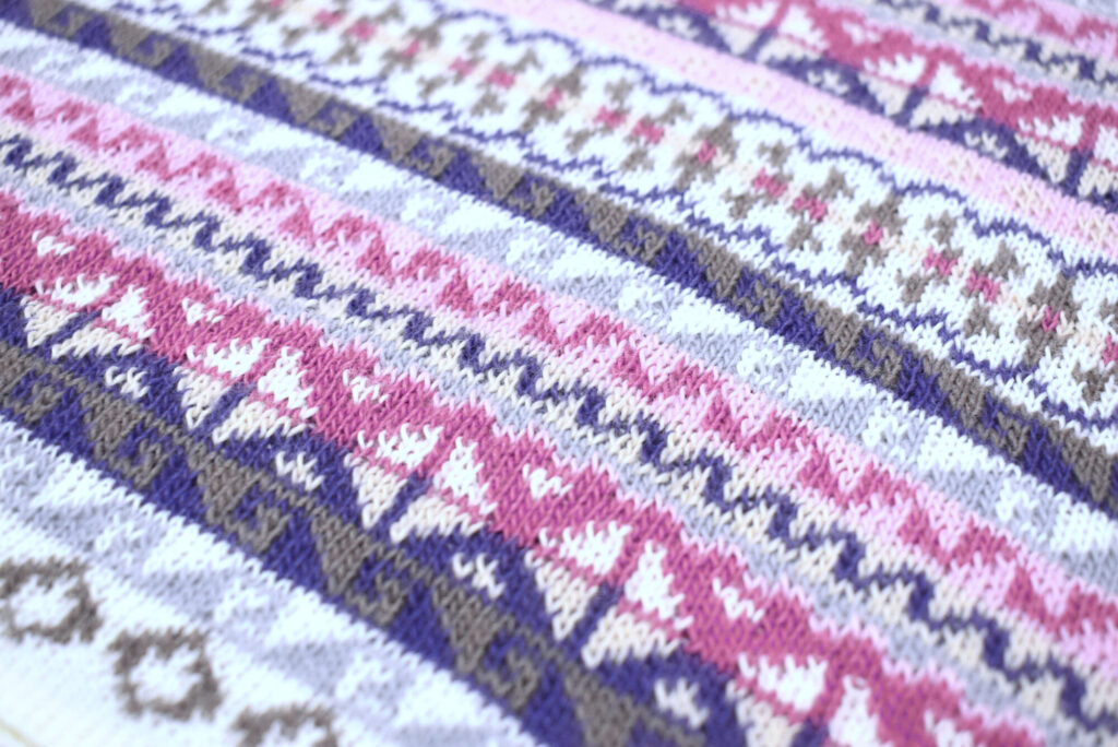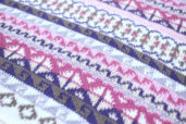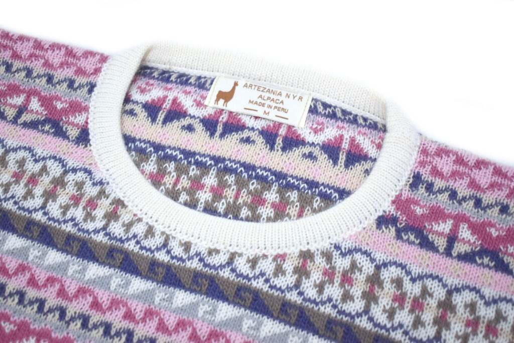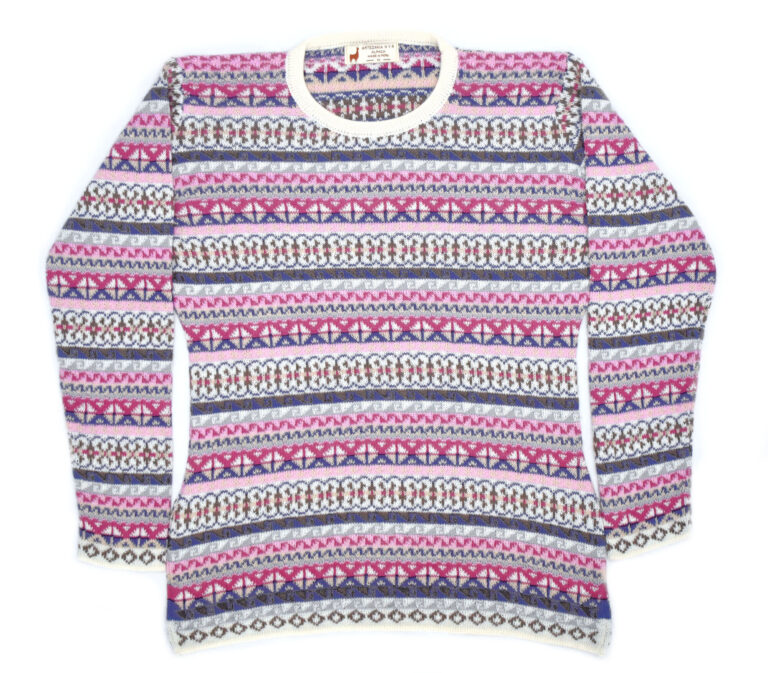 Nádherně jemný a hřejivý svetr v odstínech světle růžové, béžové a fialové. Výrazný peruánský vzor dává svetru osobitý charakter a díky vypasovanému střihu zároveň působí velmi žensky. Díky kombinaci angory a alpaky je svetr velmi příjemný na dotek a krásně zahřeje.