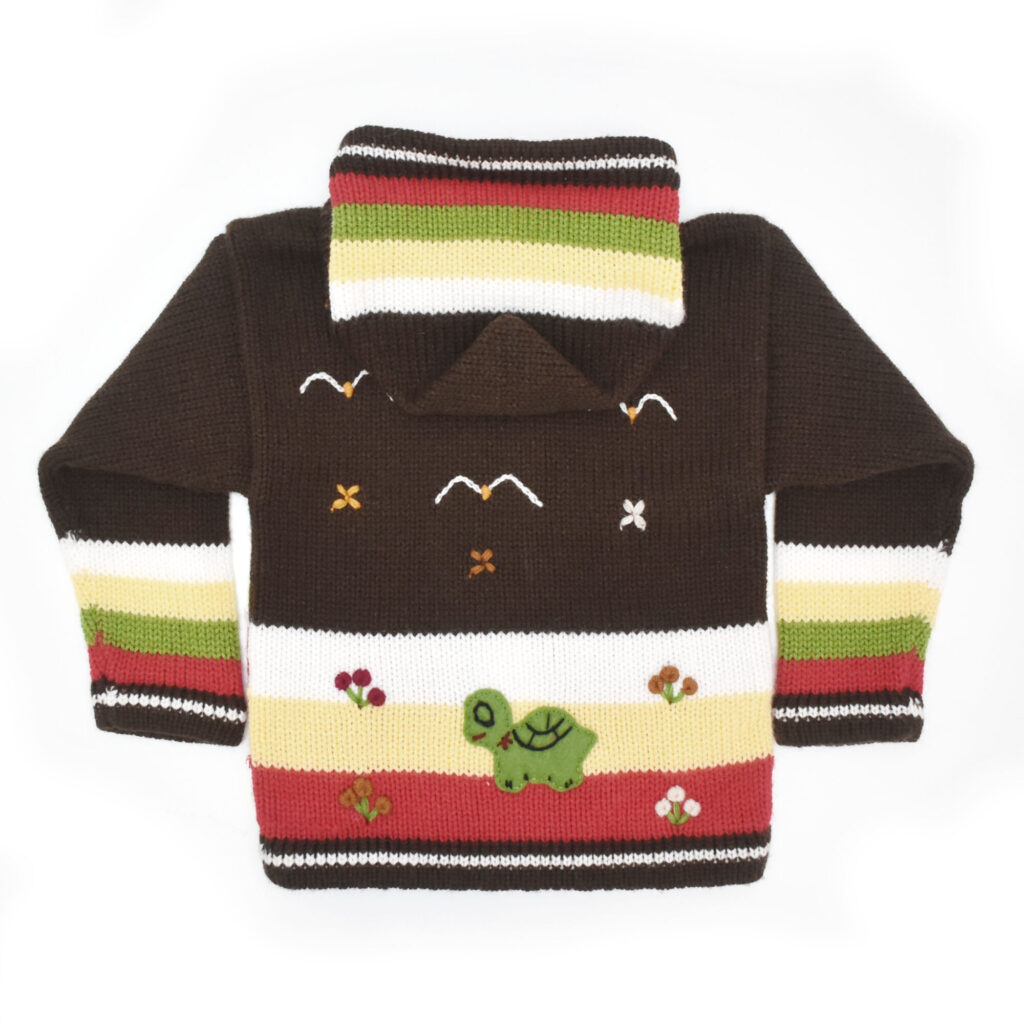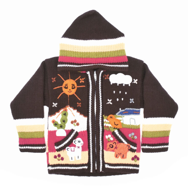 Dětský svetr plný barev a zvířátek vyráběný peruánskou tradiční technikou zvanou „arpillería peruana“. Je to technika, při které je oblečení dozdobeno výšivkami a kousky látek a zobrazuje různé výjevy ze života. V případě těchto dětských svetrů jsou hlavními motivy výjevy z peruánského venkova - zvířátka a příroda. Každý svetr je ručně dozdobený a je tak jedinečným a s láskou vytvořeným originálem, který potěší každou dětskou duši.