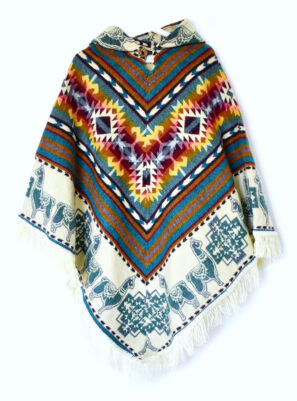 Jemné pončo tyrkysové barvy se širším barevným lemem, který znázorňuje různé tradiční peruánské motivy (lamy, andský kříž). Je lehké, ale krásně zahřeje v chladném ránu díky vlně z alpaky. Sedne velikostem S a menšímu M. Každá varianta má mírně odlišný vzorek lemu - vyberete si po kliknutí na tlačítko Koupit.