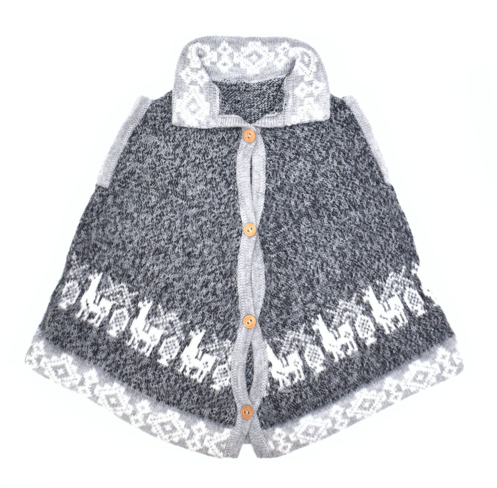 Krásná dětská vestička ve stylu pončo na knoflíčky a s otvory na rukávy. Vyrobena ze směsi vlny z alpaky a akrylového vlákna (60% vlny z alpaky). Je lehká a přitom velice dobře hřeje, zároveň má dobrou termoregulaci, takže se děti nepřehřívají. Vlna z alpaky je hypoalergenní, neškrábe ani nekouše a tak je svetřík příjemný na nošení. Ideální na výlet do přírody, ale parádu udělá i ve městě.