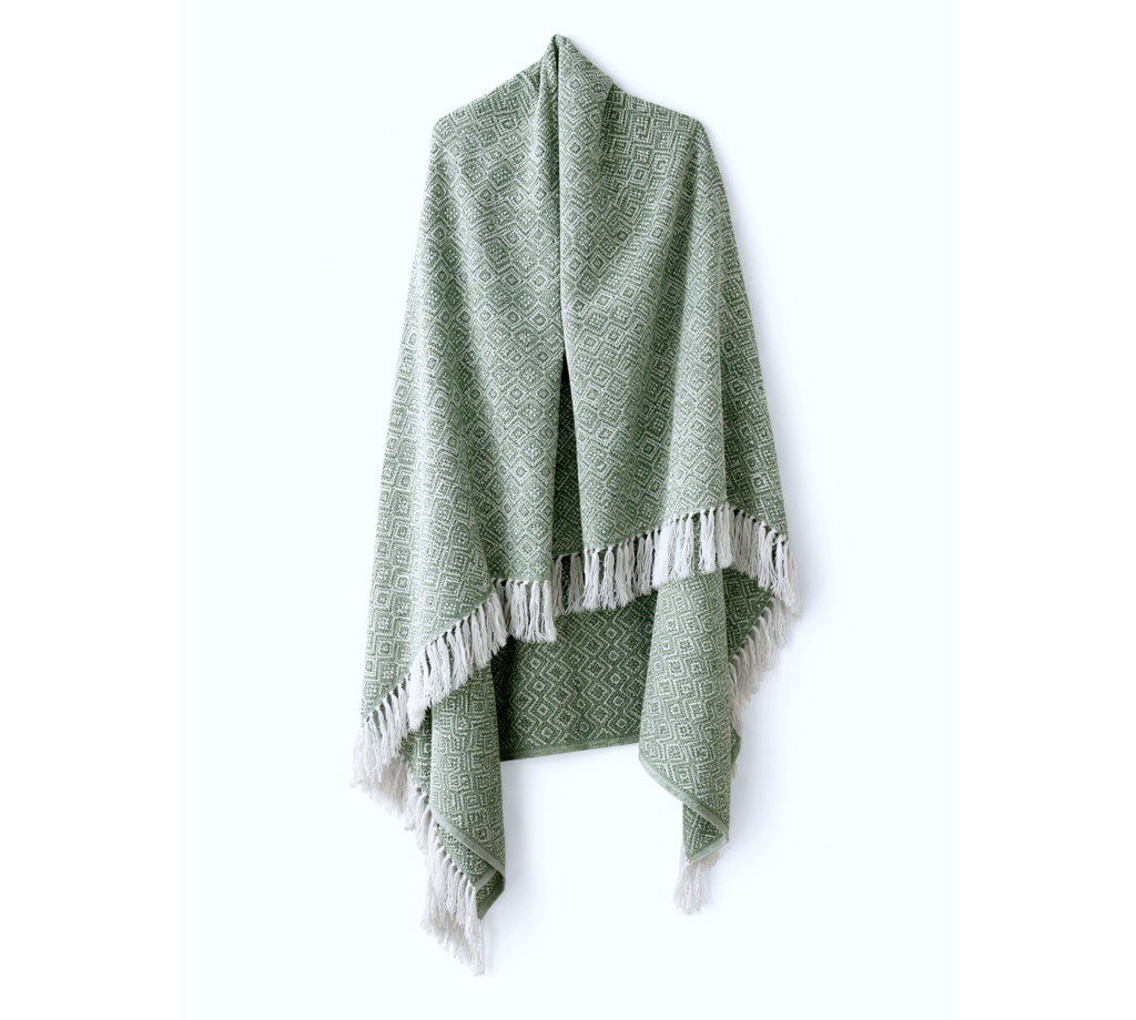 Krásný pléd větších rozměrů je příjemně hebký a měkký díky příměsi alpaky. Větší rozměry plédu nabízí jeho všestranné použití: jako pléd přes ramena, velký šál, deku nebo třeba přehoz.